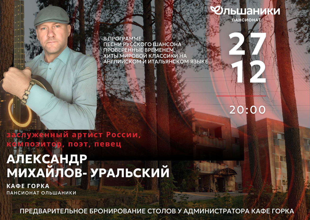 Приглашаем Вас на сольный концерт Заслуженного артиста России, композитора, поэта, певца Александра Михайлова-Уральского. Который состоится 27 декабря в 20:00 в кафе Горка