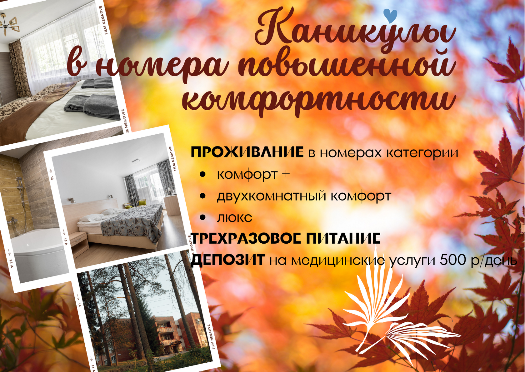 Для ваших приятных и полезных процедур — депозит на медицинские услуги составляет 500 руб. в день на каждого гостя при проживании в номерах: люкс, комфорт +, двухкомнатный комфорт.